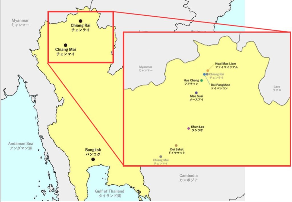 チェンライ南西端にあるウィエン・パ・パオという地区。クンラオ村は大道路からすぐの集落で、各地からアクセスしやすい地域のため、タイ国内のロースターから人気のエリアです。伝統的なお茶畑が有名で、最近ではお茶の発酵方法を利用したユニークな精製方法を編み出しています。お茶はこの地域の主要な換金作物。集落の多くの方の軒先でもコーヒーを乾燥させており、農園以外の道中にもコーヒーノキが点在しています。標高はさほど高くないものの、地面は水分をしっかり含んでおり冷涼な空気が流れるため、寒暖差が生まれやすくコーヒーはしっかりとした甘さが特徴です。