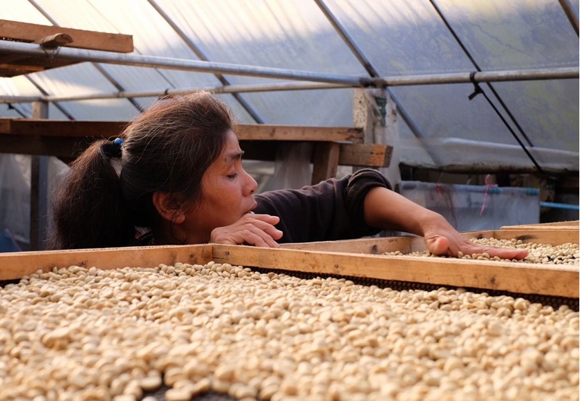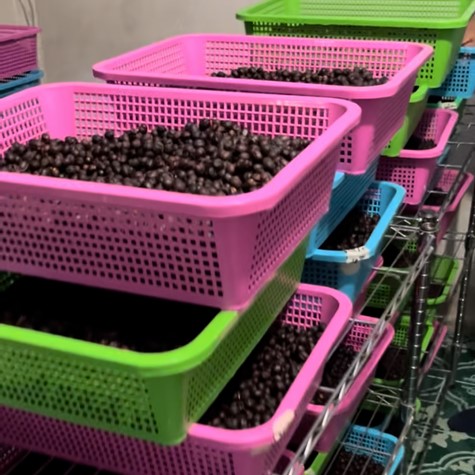 以前はスリさんのロットは家族ロットに含まれ、他のコーヒーと混ぜて輸出されていました。しかし、収穫期にカッピングを行った際、彼女のコーヒーが家族ロットの中でも際立っていると感じました。そのため、2024年から彼女のコーヒーを単独のマイクロロットとして分けて販売しています。チェリーの状態で48時間嫌気性発酵、その後果肉除去、水洗、ソーキング(水に浸ける)を行います。自作の乾燥用ドームの中で14日間除湿器を使用しながら常に空気を対流させ乾燥させてできたロットです。